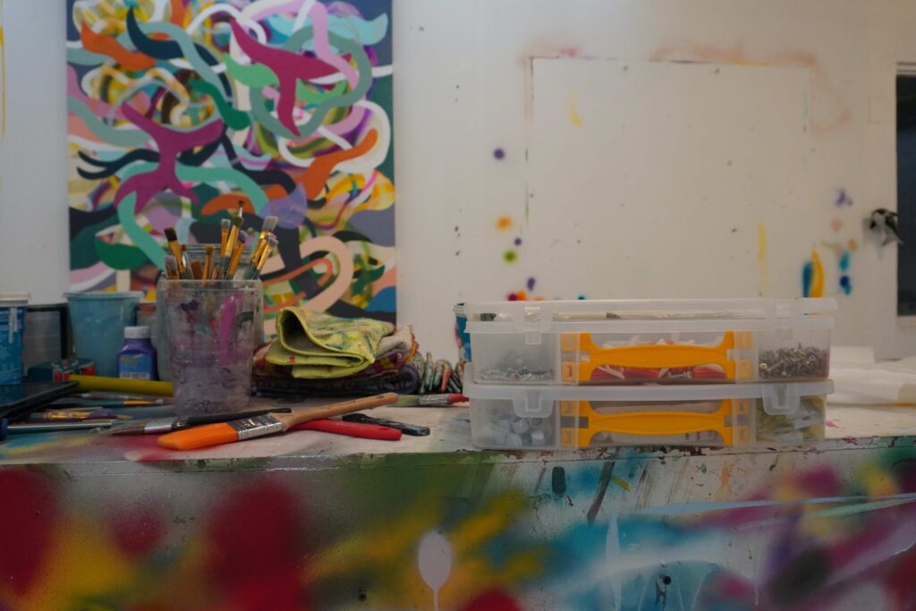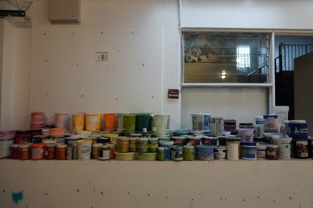 Donde les pinta encima a sus obras viejas. Las destruye. Las arregla. Sabe que él es el creador de sus piezas y que tiene completo control sobre ellas. Las puede transformar y volver a hacerles caminos nuevos.