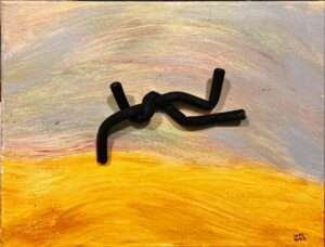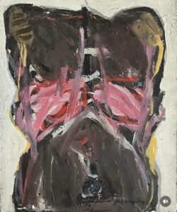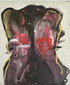 La pintura se revela como una extensión del cuerpo del artista, su mano agitándose cual brocha mientras una sensación, nacida en sus entrañas, dirige sus manos y dedos casi de manera automática, confiriéndole un rostro a todo aquello que su interior rebasa. Y entre arañazos y caricias, emerge una volatilidad entrañable, una pieza que aborda el encierro, las restricciones y el miedo inherente a habitar un cuerpo gordo rural trans no binario.