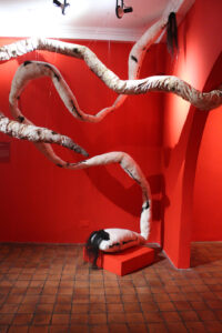 La instalación de Emma Segura Calderón presenta dos esculturas blandas de gran formato que emergen de una investigación autorreferencial, posicionando el cuerpo trans* como territorio y materia viva. Elaboradas con algodón, tintes naturales, cabello humano y sintético, bordados y fieltrados, estas esculturas se conciben como extensiones corporales y geografías emocionales que desafían marcos normativos. La abstracción en su obra no busca la despolitización, sino que funciona como una estrategia urgente para desestabilizar regímenes de visibilidad hegemónicos. Así, lo abstracto se convierte en un medio para resistir la mirada normada y encarnar modos alternativos de existencia y percepción del mundo, abriendo espacio a diversas formas de ser.