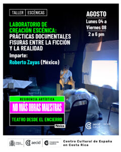 El taller “Laboratorio de creación escénica: Prácticas documentales fisuras entre la ficción y la realidad” propone una estrategia que permita dotar de diversas herramientas de investigación-creación para aplicarlas en el diseño de una propuesta escénica que contenga archivos y documentos potencialmente atractivos para las personas participantes. Este pretende indagar sobre las problemáticas que atraviesa el actual Sistema Penitenciario y de Justicia en Costa Rica y Centroamérica, partiendo de la experiencia de TDEE, abordando y llevando a la escena las realidades penitenciarias y de justicia en México, promoviendo una cultura de la paz a través de las prácticas escénicas. Durante el laboratorio se presentarán algunos de los conceptos que su director, Roberto Zayas, ha trabajado con el fin de abrir la discusión acerca de los modos de abordar tópicos como la memoria, el testimonio y la ausencia en relación con la idea de archivos vivos, esto con el fin de explorar las posibilidades para crear estrategias alternativas en la creación artística y teatral. Estas estrategias podrán ser utilizadas para desdibujar los límites entre las nociones de realidad y ficción; y así, poder transitar indistintamente de un lado al otro para revertir los signos, desafiar las normas y desequilibrar la certeza.