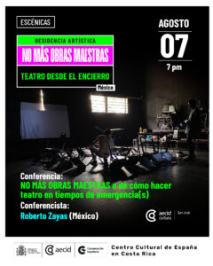 “No Más Obras Maestras o de cómo hacer teatro en tiempos de emergencia(s)” es una conferencia para personas de la escena y de la vida, que busca indagar la relación entre escena y realidad, a partir
